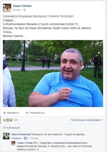 Журналист Саша Сотник на своей странице в Фейсбуке сообщил о смерти представителя Уполномоченного Верховной Рады Украины по правам человека, журналиста Владимира Шрейдлера.