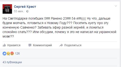 "На Светлодарске погибших 5!!!! Ранено 23!!!! 54-я!!!(((( Ну что, дальше будем молчать, готовиться к Новому Году??? Постить х...ту про эту конченную Савченко? Забивать эфир разной х...ёй, и ложиться спокойно спать??? Или обсудим, почему я это не написал на украинской мове??" - пишет боец.