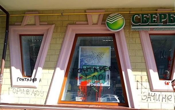 В центре Одессы украинские патриоты "украсили" отделение "Сбербанка России" краской и надписями.