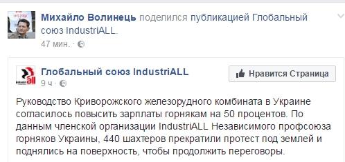 Сегодня утром, 11 мая, глава Независимого профсоюза горняков Украины Волынец на своей странице в Фейсбуке поделился публикацией Глобального союза IndustriALL в которой говорится, что руководство Криворожского железорудного комбината в Украине согласилось повысить зарплаты горнякам на 50 процентов. По данным членской организации IndustriALL Независимого профсоюза горняков Украины, 440 шахтеров прекратили протест под землей и поднялись на поверхность, чтобы продолжить переговоры.