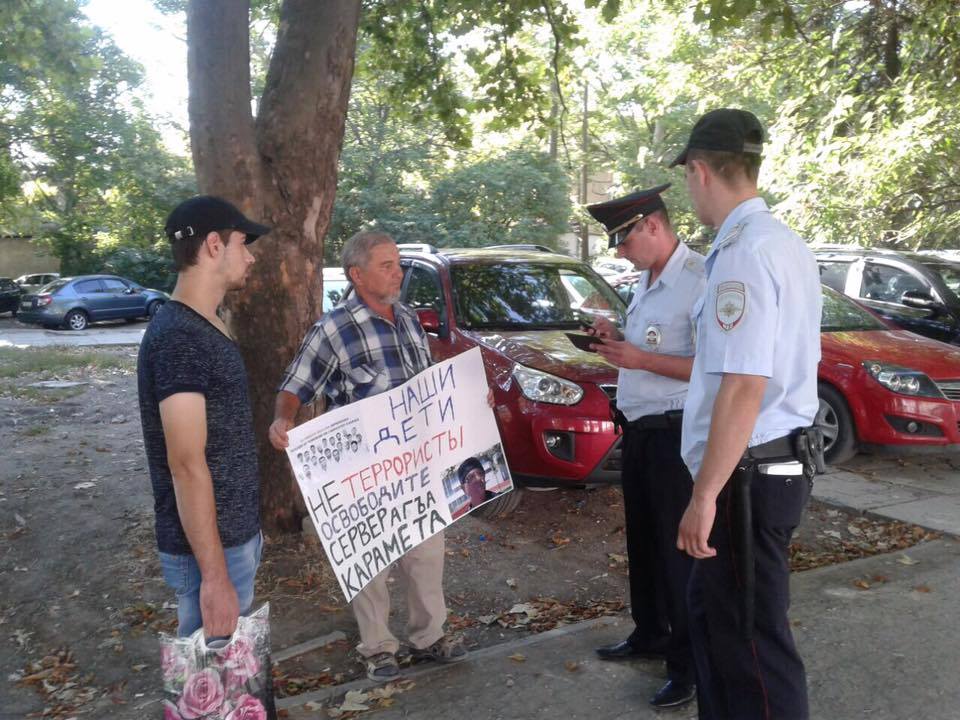 "В ответ на арест 76-летнего Сервера Караметова сегодня в Симферополе как минимум еще 4 пожилых людей провели свои одиночные пикеты с таким же плакатом, какой был в руках у Сервер-ага «Путин, наши дети не террористы» . Известно, что пикеты прошли у здания парламента, Совмина, МВД и Верховного суда Крыма. По последним данным, 2 стариков уже задержали", - пишет она.