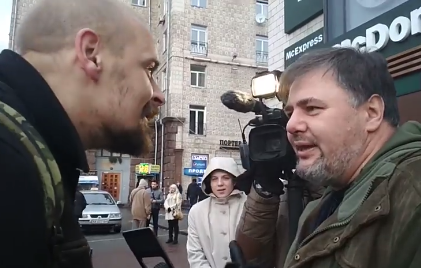 Скандальный журналист Руслан Коцаба получил в лицо от добровольца «Правого сектора» Алексея Быка. Инцидент был запечатлен на видео.