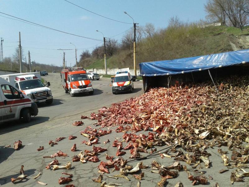 Грузовой автомобиль во время дорожно-транспортного происшествия перевернулся, и на дорогу высыпались кости - сырье, которое должны были доставить на "Лисичанский желатиновый завод". Маршрутное такси съехало с дороги и зависло над оврагом. Обе машины превратились в груду металла.