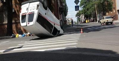 Столкновение микроавтобуса «Пежо» и автомобиля «ВАЗ 2101» произошло на пересечении улиц Торговой и Георгиевской. В результате ДТП маршрутка перевернулась, передает Час Пик со ссылкой на украинские СМИ.