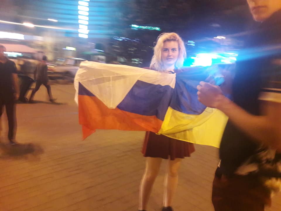На кадрах можно увидеть, как автор записи подходит к подвыпившей компании, которая держит украинский и российский флаги. Молодым людям пытались объяснить, что символике стране-оккупанта в столице Украины не место.