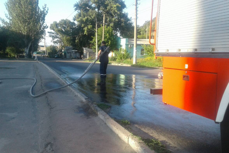 В Лисичанске работники ГСЧС смывают с дороги зловонную жидкость, которая вытекла из автомобиля, везущего сырье на Лисичанский желатиновый завод.