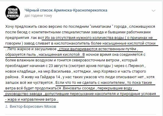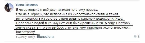 Но я не про это.Про ВЫБРОСЫ.Не цитируйте брехню-это испарения кислоты из кислотоотстойника.Причина-РФ не решила проблему воды,жизненно важную для Крыма pic.twitter.com/QoqyVVP9dh— RoksolanaToday&Крым (@KrimRt) 29 августа 2018 г.