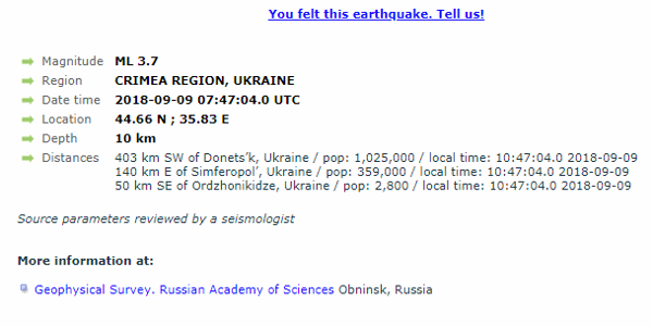 У восточной части оккупированного Крыма произошло землетрясение магнитудой чуть менее 4 баллов.