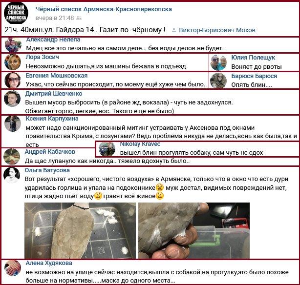 "Крым. "Опять газовая камера,как в концлагере третьего рейха!" - Армянск и окрестности накрыла новая волна кислоты. Люди массово обзванивают все горячие линии (сотни сообщений таких - их не скринил). Прочтите, что происходит в эти минуты. Это геноцид, устроенный ОККУПАНТАМИ!" - пишет блогер.