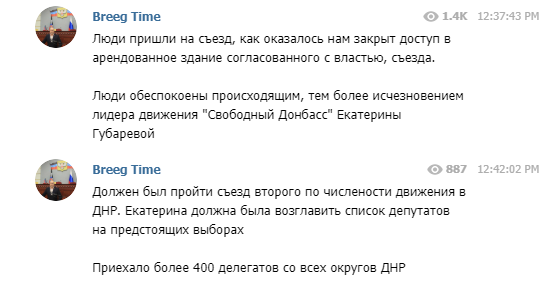 "Люди пришли на съезд, как оказалось нам закрыт доступ в арендованное здание согласованного с властью, съезда. Люди обеспокоены происходящим, тем более исчезновением лидера движения "Свободный Донбасс" Екатерины Губаревой.