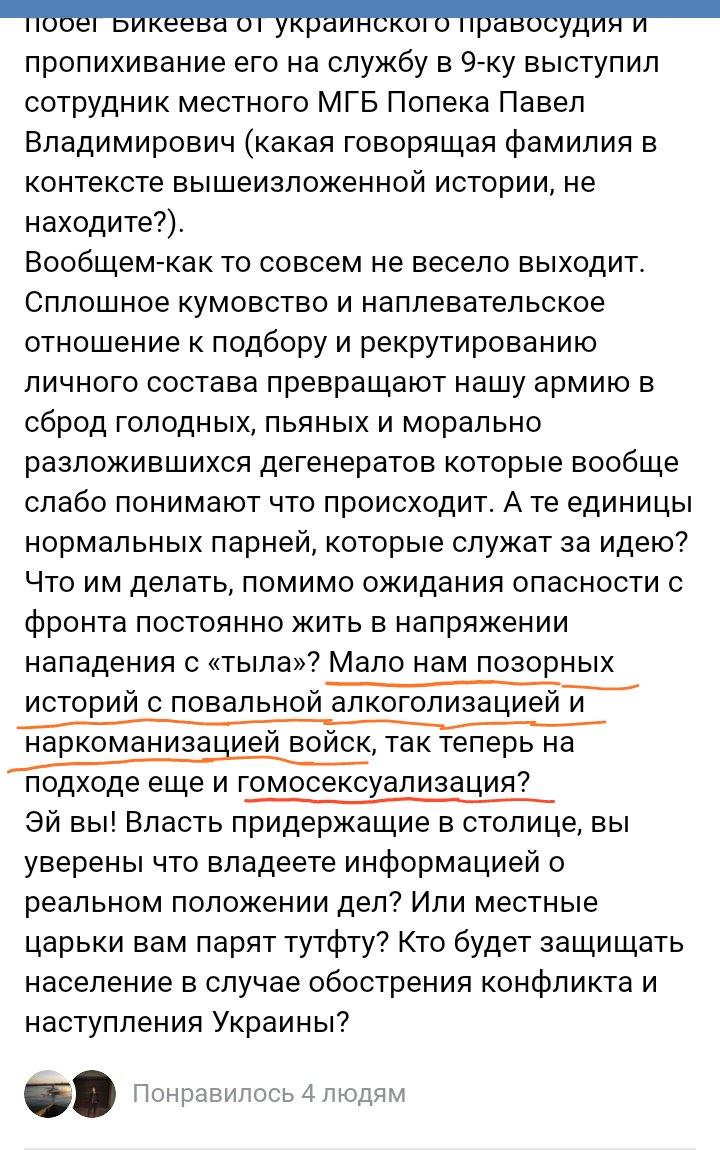 Как следует из опубликованной истории, инцидент произошел в больнице оккупированного Новоазовска. Террорист "ДНР" Бикеев Юрий Викторович 1969 года рождения напоил до беспамятства своего сослуживца и надругался над ним "в особо извращенной форме". Виновника происшествия командование пытается выставить невменяемым.