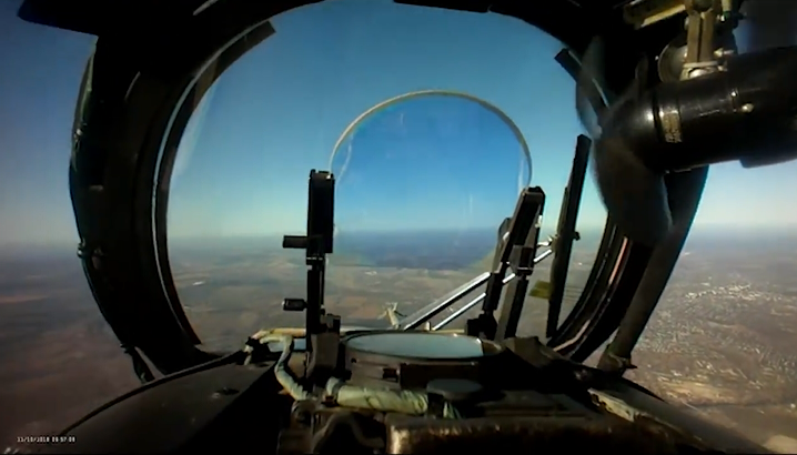 "Экипаж вертолета Ми-24 на практике проверил полученные навыки в борьбе с беспилотными летательными аппаратами. Российский беспилотный летательный аппарат "Орлан-10" маневрировал по высоте и по направлениям, но пилоты Объединенных сил не оставили ему шансов. Короткая очередь из вооружения ударного вертолета - вражеский беспилотник падает.
