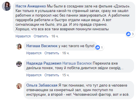 Как рассказала в Фейсбуке местная жительница Наталья Василюк, во время просмотра фильма в кинотеатре "Мультиплекс" зрители почувствовали запах дыма. Пожарная сигнализация не сработала, эвакуацию людей не организовали.