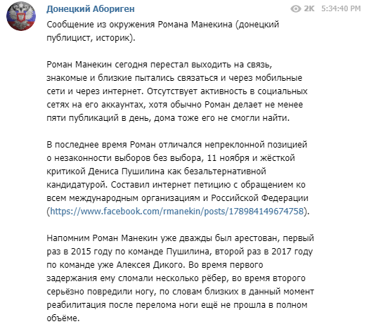 В последнее время Роман отличался непреклонной позицией о незаконности выборов без выбора, 11 ноября и жёсткой критикой Дениса Пушилина как безальтернативной кандидатурой. Составил интернет петицию с обращением ко всем международным организациям и Российской Федерации", - отмечается в посте.