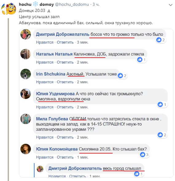 Как сообщается, двойной взрыв был слышен с северо-западного направления. Пользователи сети высказывают предположения, что отработало ПВО, либо был исходящий выстрел в сторону Марьинки. При этом дончане пишут, что звука падения не было слышно.