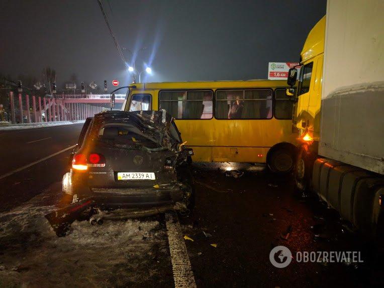 Как сообщается, пострадавшие автомобили двигались со стороны Киева. Они стояли на светофоре в тот момент, когда фура начала двигаться по диагонали из крайней полосы. Грузовик зацепил одну из машин, врезался в отбойник, после чего протаранил остальные авто.