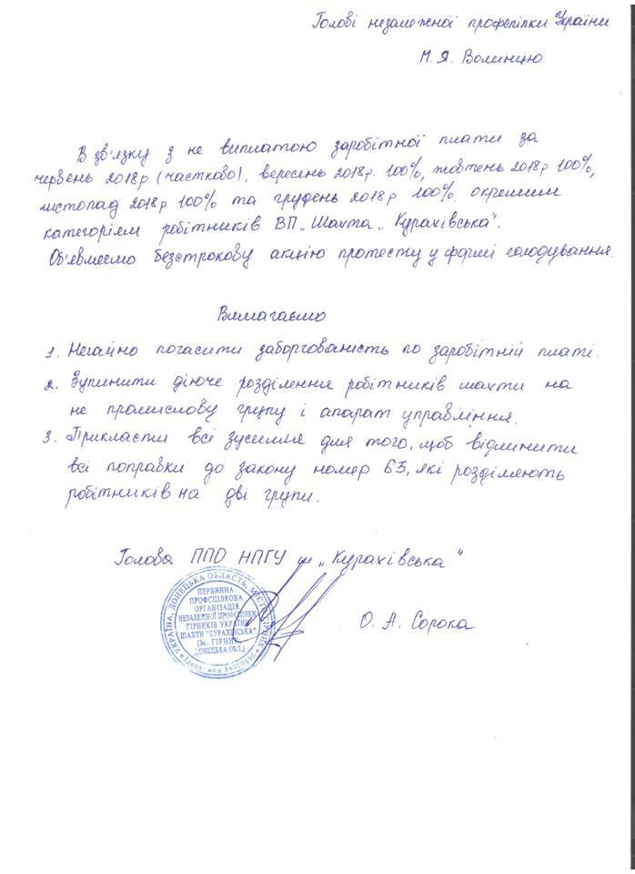 «Как сообщил председатель местной организации Независимого профсоюза горняков Украины городов Селидово и Новогродовка Виктор Трифонов, сегодня утром участковый маркшейдер и главный геолог шахты «Кураховская» ГП «Селидовуголь» объявили голодовку в связи с существующей задолженностью по зарплате. Сегодня утром двое работников шахты «Кураховская» Дорда Елена Эдуардовна, главный геолог, и Нечипорук Андрей Викторович, начали акцию протеста в форме голодовки. Главное требование – это погашение задолженности по зарплате за последние месяцы 2018 года – июнь (частично), сентябрь, октябрь, ноябрь и декабрь», - написал Волынец.