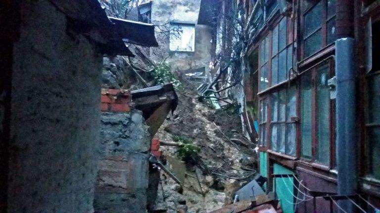 Жители дома сообщили, что рухнула опорная стена дома, а двор затопила смесь земли и воды.