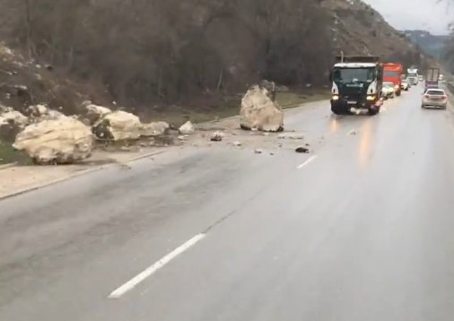 Там произошло обрушение части скалы, после чего один из камней опасно завис над дорогой. Спасатели приняли решение искусственно обрушить булыжник объемом 1,5 м куб.