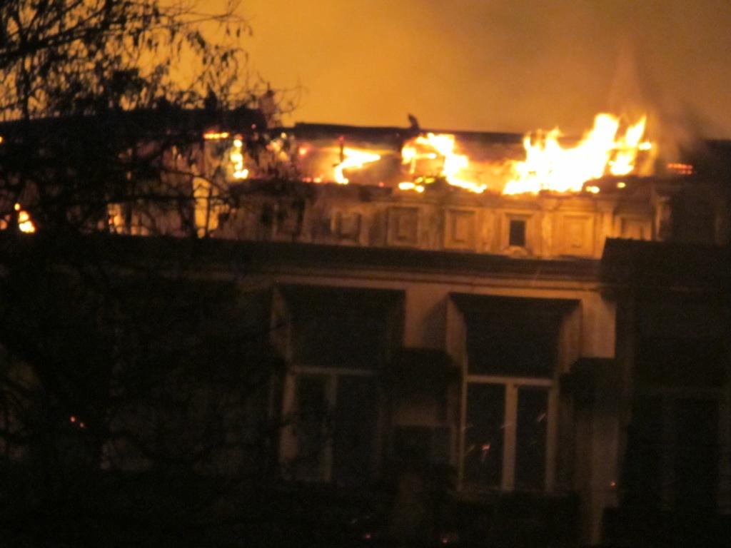 "По предварительным данным, возгорание произошло на чердаке четырехэтажного дома. Вследствие распространения огня взорвался вероятно газовый баллон, в результате чего был травмирован спасатель ГСЧС. Его доставили в больницу с ушибами плеча и ребер", - говорится в сообщении полиции.