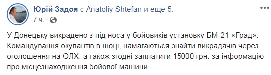 Пользователь Фейсбука Юрий Задоя опубликовал пост о том, что в Донецке из-под носа боевиков украдена установка БМ-21 "Град".