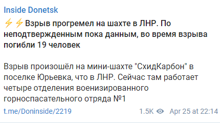 "Взрыв произошёл на мини-шахте "СхидКарбон" в поселке Юрьевка, что в ЛНР. Сейчас там работает четыре отделения военизированного горноспасательного отряда №1. По неподтвержденным пока данным, во время взрыва погибли 19 человек", - сообщает Телеграм-канал "Inside Donetsk".