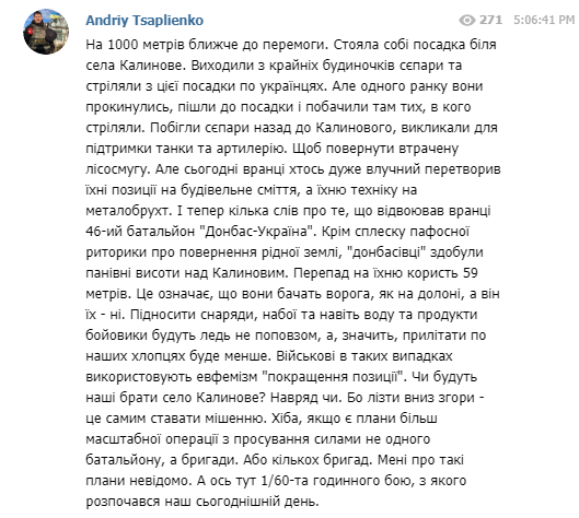 Выяснилось, что в результате этого боя батальон "Донбасс-Украина" продвинулся и занял выгодные высоты в районе с. Калиново. Об этом сообщил в своем Телеграм-канале военный журналист Андрей Цаплиенко, передает Час Пик.