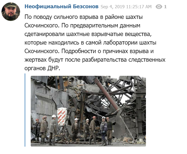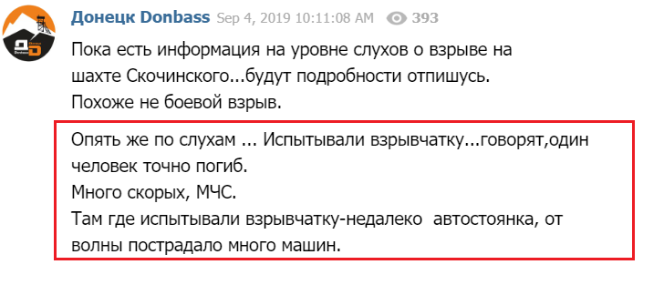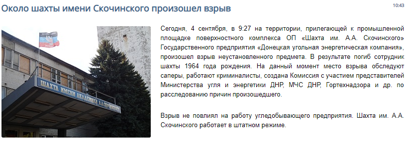 Тем временем уже появилась "официальная" информация от "минугля ДНР": якобы на прилегающей территории взорвался "неустановленный предмет", что повлекло гибель сотрудника шахты 1964 г.р.