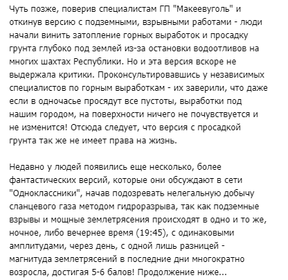 Другая версия происхождения землетрясений - затопление горных выработок и просадка грунта глубоко под землей из-за остановки водоотливов на шахтах. Некоторые пользователи соцсетей подозревают нелегальную добычу сланцевого газа методом гидроразрыва и даже подземные испытания атомных бомб.