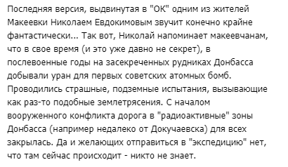 Один из местных Телеграм-каналов собрал информацию по этой теме. Сообщается, что подземные толчки неизвестного происхождения начались еще год назад, однако прекратились после сотен жалоб жителей в администрацию города. Теперь толчки возобновились с новой силой, особенно они ощущаются в Советском районе Макеевки.