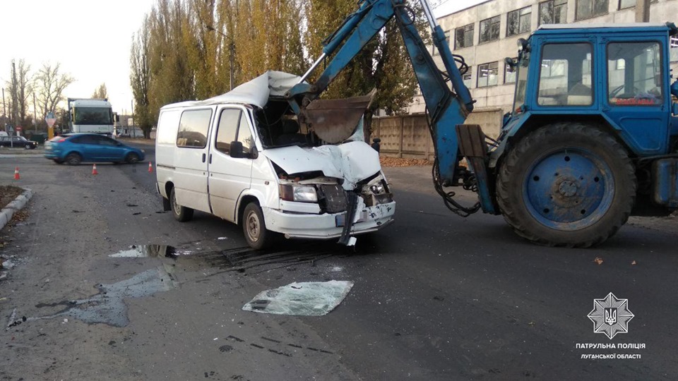 В городе Рубежное Луганской области произошло ДТП с участием легкового автомобиля и трактора. Ford Transit влетел в ковш трактора, пострадали два человека.
