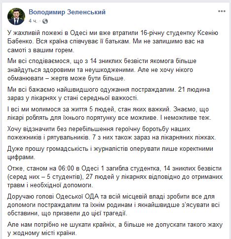Глава государства надеется, что те, кто сейчас считаются пропавшими без вести, найдутся живыми. Зеленский также отметил героическую борьбу пожарных и спасателей, семеро из которых находятся в больницах. Он поручил руководителю Одесской ОГА Максиму Куцему и всей местной власти сделать все возможное для помощи пострадавшим и их семьям.