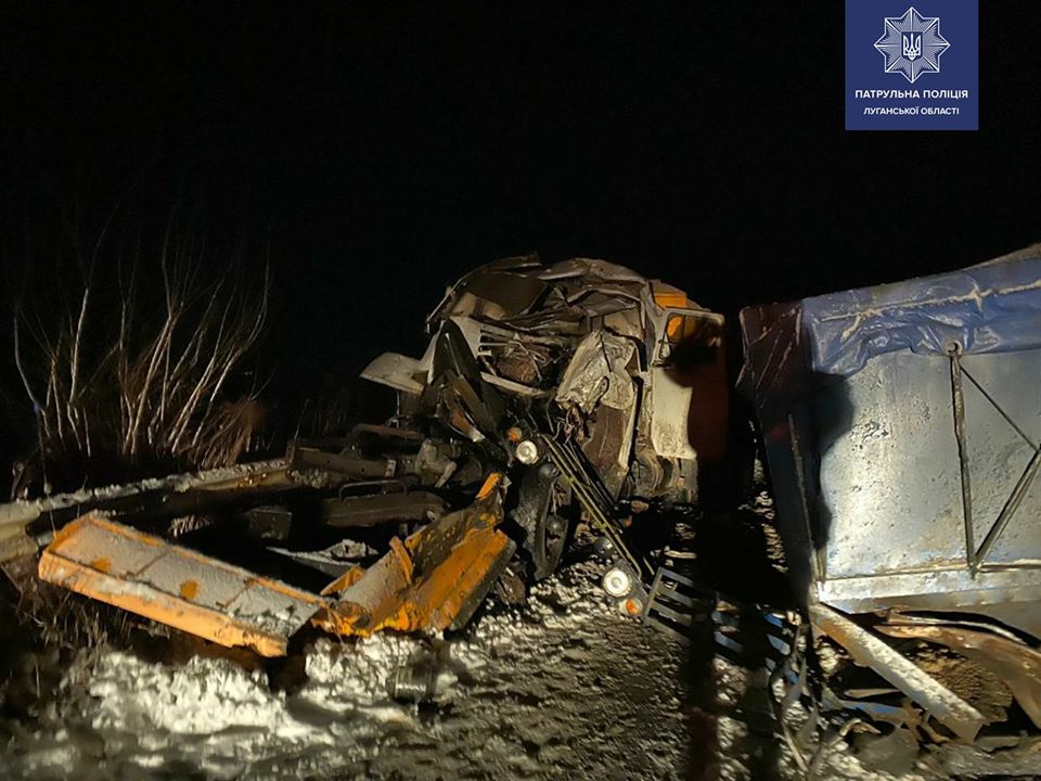 По предварительной информации водитель "КрАЗ", двигаясь в сторону города Счастье, не справился с управлением и совершил столкновение с прицепом автомобиля "КамАЗ".