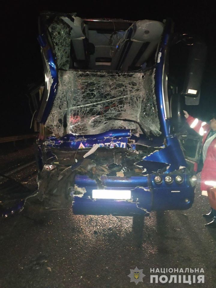 ДТП произошло на 295 км автодороги М-05 "Киев - Одесса" возле пгт Кривое Озеро 19 февраля около 1:30. Столкнулись рейсовый автобус Temsa Diamond сообщением "Одесса - Киев" и грузовой автомобиль Volvo с полуприцепом, сообщает Час Пик со ссылкой на Отдел коммуникации ГУ Нацполиции Николаевской области.