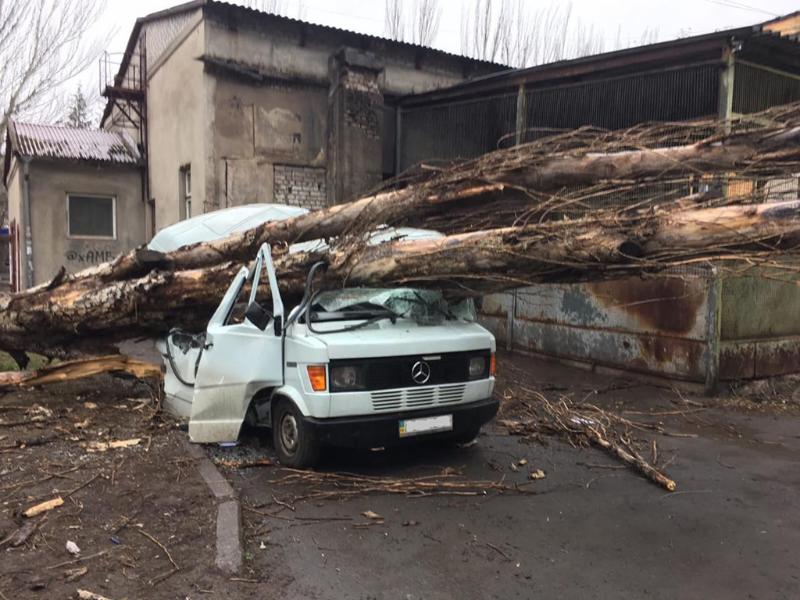 В Кривом Роге на автомобиль упало 12-метровое дерево, заблокировав проезд возле многоэтажки. Спасатели распилили дерево бензопилой и убрали с автомобиля.