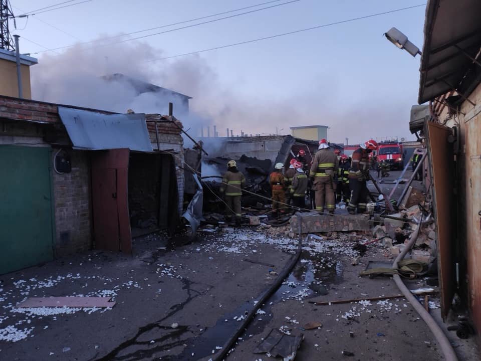 В результате взрыва произошло обрушение бетонных конструкций рядом расположенных гаражей. Сотрудники Киевской службы спасения проводят разборку завалов.