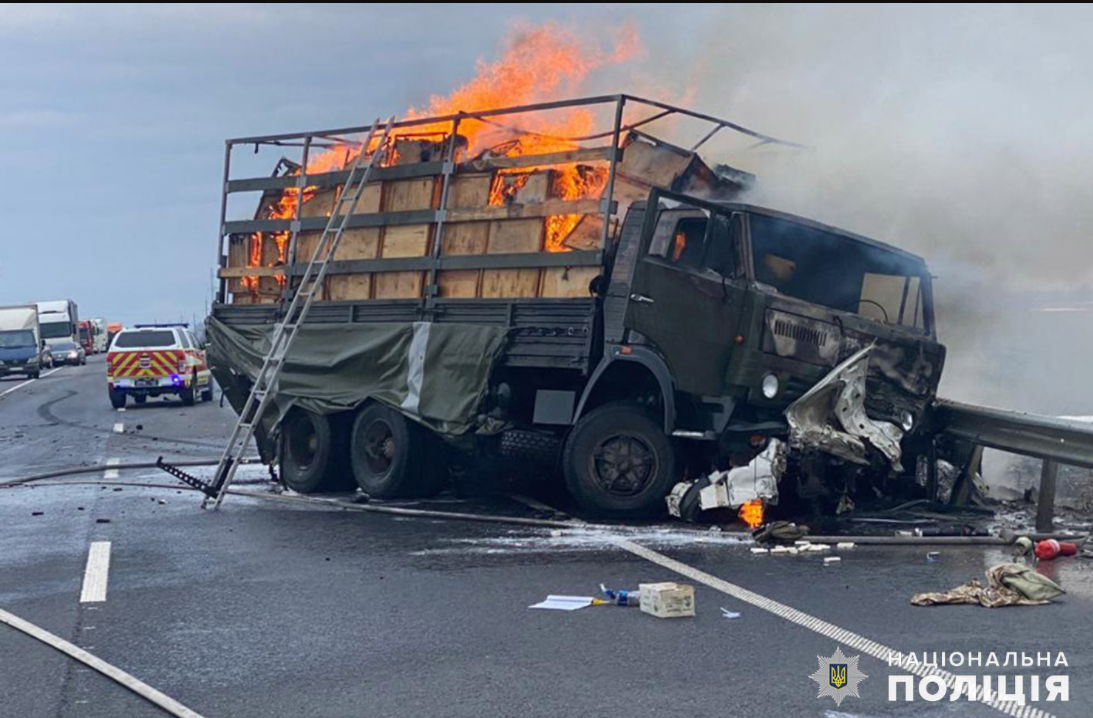 Столкнулись "КамАЗ", за рулем которого находился 39-летний житель Львова, и легковой автомобиль Audi. В результате столкновения оба авто загорелись.