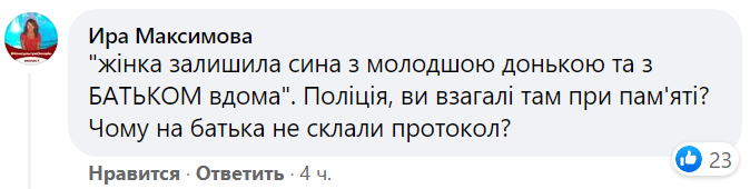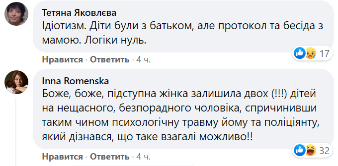Под соответствующим постом на странице полиции Киева в Фейсбуке уже более 2000 комментариев. Действия полиции вызвали у граждан вопросы: в частности, почему протокол составили только на маму и с ней же провели профилактическую беседу, если за ребенком не уследил отец? По мнению украинцев, данный инцидент ретранслирует установку, будто вся ответственность за воспитание детей лежит на женщине, а с мужчины "взятки гладки". Также в действиях полиции увидели унижение мужчин и доказательство гендерного неравноправия в обществе.