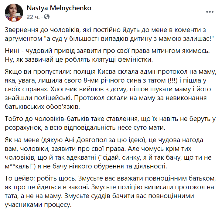 "Обратилась к заместителю Главы Национальной полиции Украины - начальнику Главного управления Национальной полиции в г. Киеве Андрею Крищенко с требованием объективно определять субъект административного правонарушения при составлении административного протокола по статье 184 Кодекса Украины об административных правонарушениях (невыполнение родителями или лицами, их заменяющими, обязанностей по воспитанию детей)", - написала Денисова в Фейсбуке.