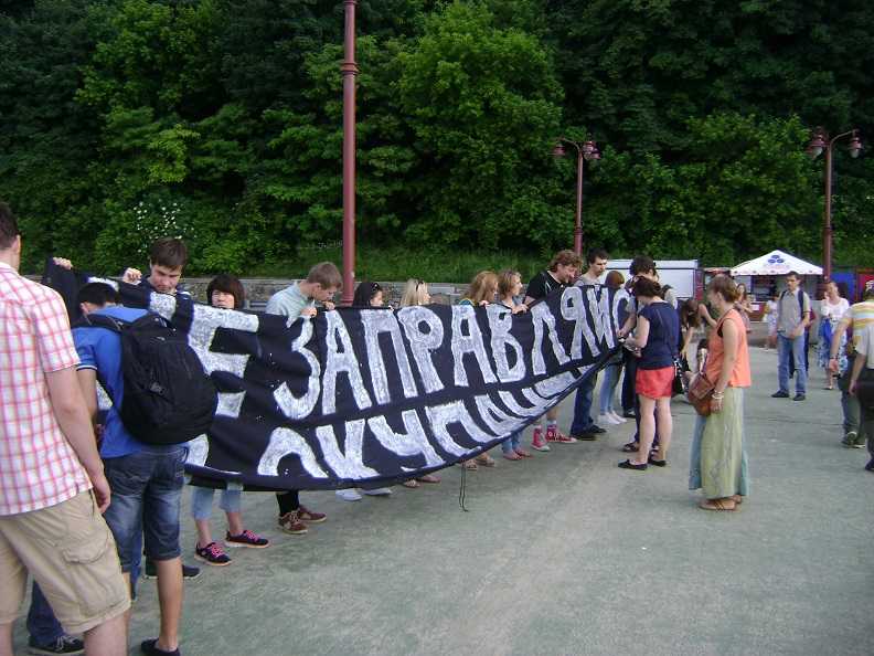 В четверг, 29 мая, активисты Гражданского движения «Отпор» вывесили на Пешеходном мосту, что на Почтовой площади в Киеве, баннер с надписью «Не заправляйся у оккупанта!» и логотипами российских заправок. Таким образом активисты призвали украинских автомобилистов не поддерживать своими деньгами захватнический кремлевский режим. Ведь известно, что нефтегазовый бизнес является основным источником доходов России, этот бизнес контролирует лично Путин и доходы с продажи бензина он направляет на войну с Украиной.