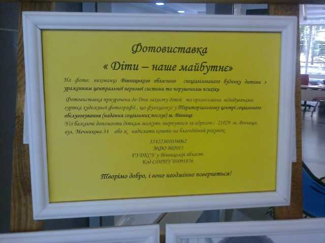 Ко Дню защиты детей Территориальный центр социального обслуживания г. Винница организовал благотворительную акцию и подготовил фотовыставку. Социальные работники отделения оказания социальной помощи собрали средства собственными силами и посетили дом ребенка, подарив детям сладости и игрушки.