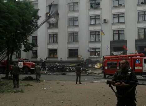 По словам очевидцев, снаряд, выпущенный самолетом-истребителем, попал, скорее всего, в кабинет председателя Луганского облсовета или в приемную.