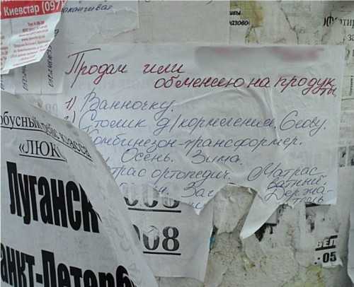 В группе «Ровеньки — Украина» в соцсети опубликовали фотографию объявления, сделанного, предположительно в Краснодоне. Автор предлагает продать или обменять на продукты детскую ванночку, комбинезон-трансформер, ортопедический и ватный матрасы и другие вещи.