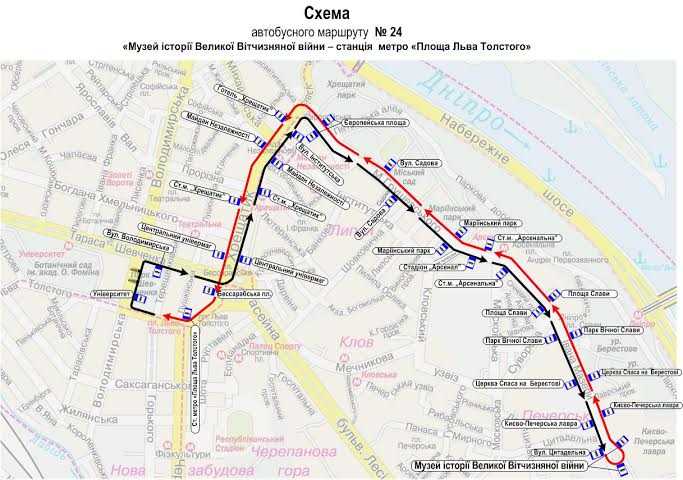 Так, работу автобусов на маршруте будет организовано по трассе: «Музей истории Великой Отечественной войны - ул. Лаврская - ул. Мазепы -ул. Грушевского - ул. Крещатик - ул. Красноармейская - ул. Льва Толстого - ул. Владимирская - бульв. Тараса Шевченко - ул. Крещатик - ул. Грушевского - ул. Мазепы - ул. Лаврская - Музей истории Великой Отечественной войны».