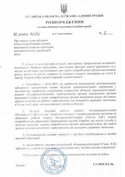 Распоряжение на основании статьи 6 Закона Украины «О местных государственных администрациях» подписал председатель Луганской ОГА Геннадий Москаль.