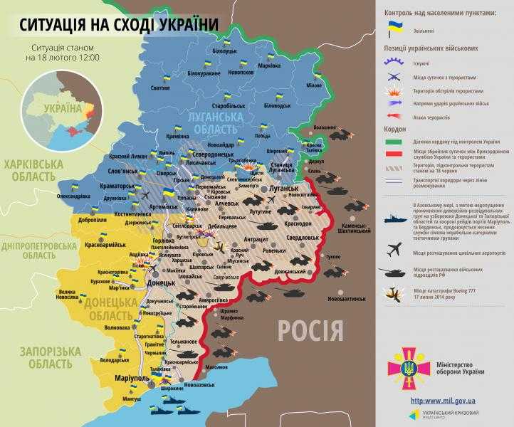 Редакция "Час Пик" Ситуация в зоне АТО по состоянию на 18 февраля Теги: Донецкаятерриториальная войнаНовости Донбасса По теме Россия уничтожила промышленность Донбасса - люди вынуждены работать за едуВСУ освободили девять населенных пунктов на Очеретинском направлении и сдерживают РФ под ПокровскомВ Донецкой области после российского обстрела поврежден аммиакопровод "Одесса-Тольятти" - ВСУ