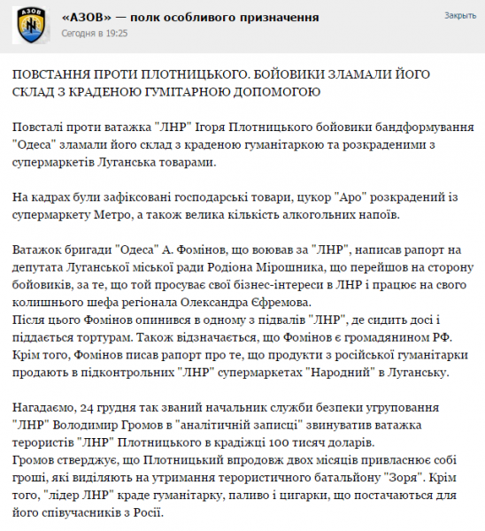 Представители батальона "Одесса" совершили взломали склад, принадлежащий ЛНР и лично главе самопровозглашенной республики Игорю Плотницкому.