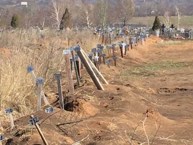 На одном из кладбищ на окраине города Енакиево, захваченного формированиями сепаратистов ДНР, после боев под Дебальцево появилось большое безымянное захоронение. Могилы на нем обозначены только табличками с номерами, при этом располагаются кучно в один ряд, как будто мертвых хоронили в траншеи. Судя по номерам на табличках, захоронения включает более 700 могил.