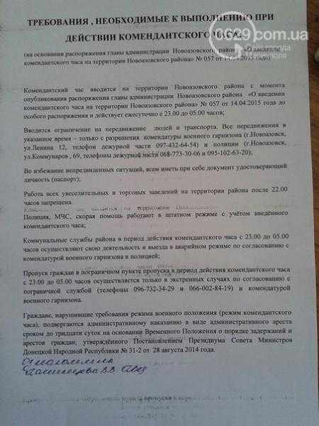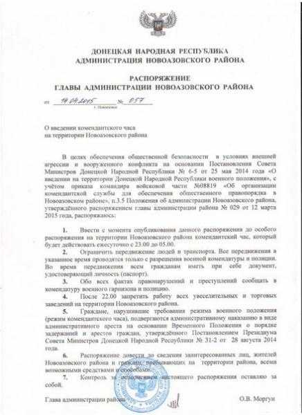 Экс-главный милиционер Мариуполя, а ныне глава Новоазовского райадминистрации Олег Моргун подписал распоряжение "О введении комендантского часа на территории Новоазовского района".