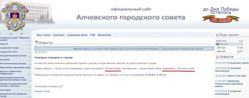 В качестве оплаты за труд, сепаратисты обещают платить в день одной буханкой хлеба, а также давать каждую неделю продуктовый набор. Об этом говорится на официальном сайте Алчевского городского совета.
